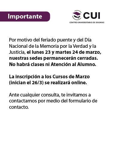 Todavía podes inscribirte a los Cursos de de Marzo de 2,3 y 4 meses. Preparación a Exámenes Internacionales. Curso Anual de LLOO. Más info en "ver más".